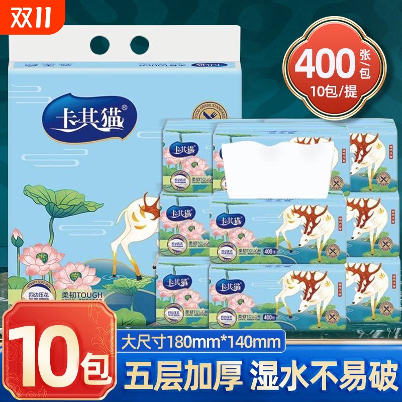 卡其猫国潮抽纸可湿水面纸巾家用擦手纸餐巾卫生纸5层加厚抽取式