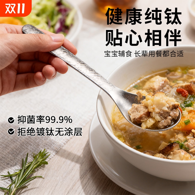 纯钛勺子汤勺中式冰花儿童调羹便携吃饭勺餐具家用露营汤匙加厚