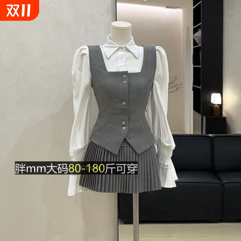 法式小众甜酷西装马甲长袖衬衫短裙女秋季大码时尚三件套装潮开衫