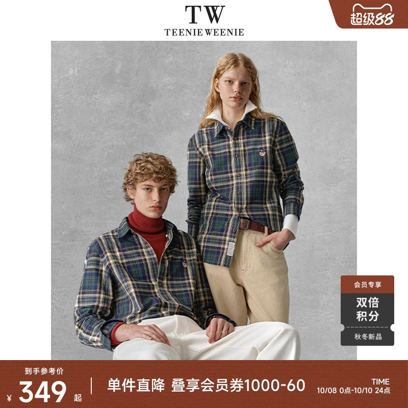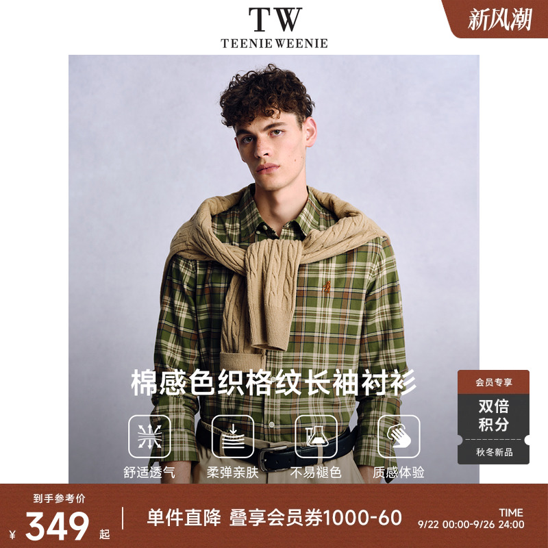 Teenie Weenie小熊男装简约长袖休闲宽松刺绣格纹翻领衬