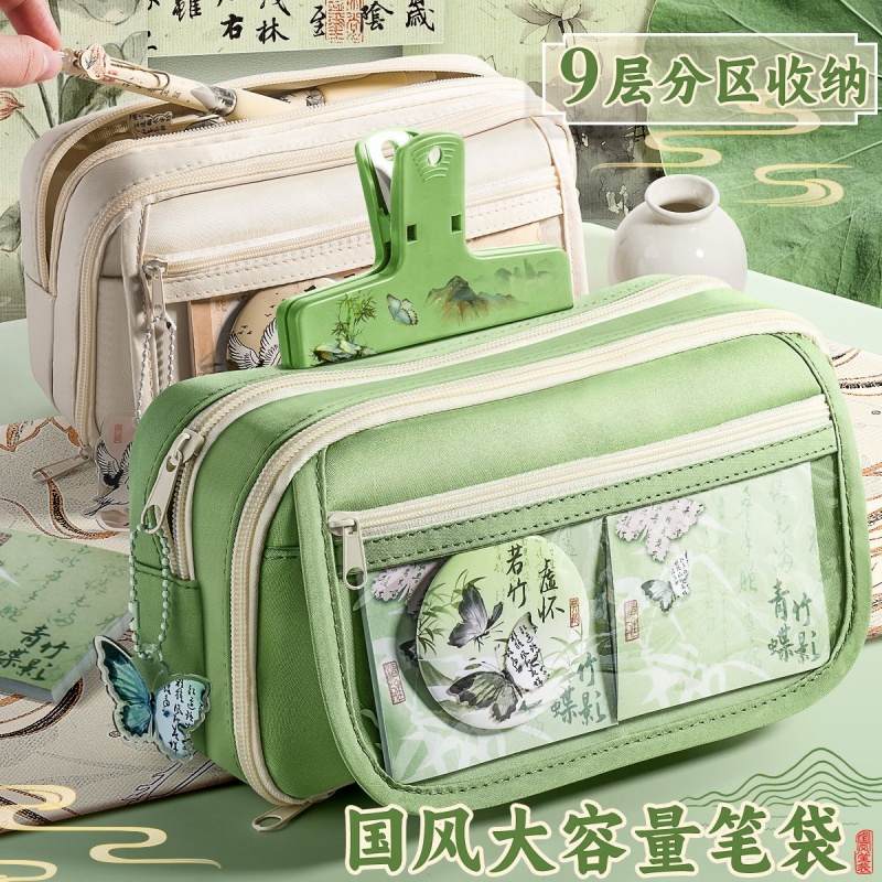 多层笔袋大容量透明绿色古风小学生专用女文具盒高颜值男孩铅笔收纳袋