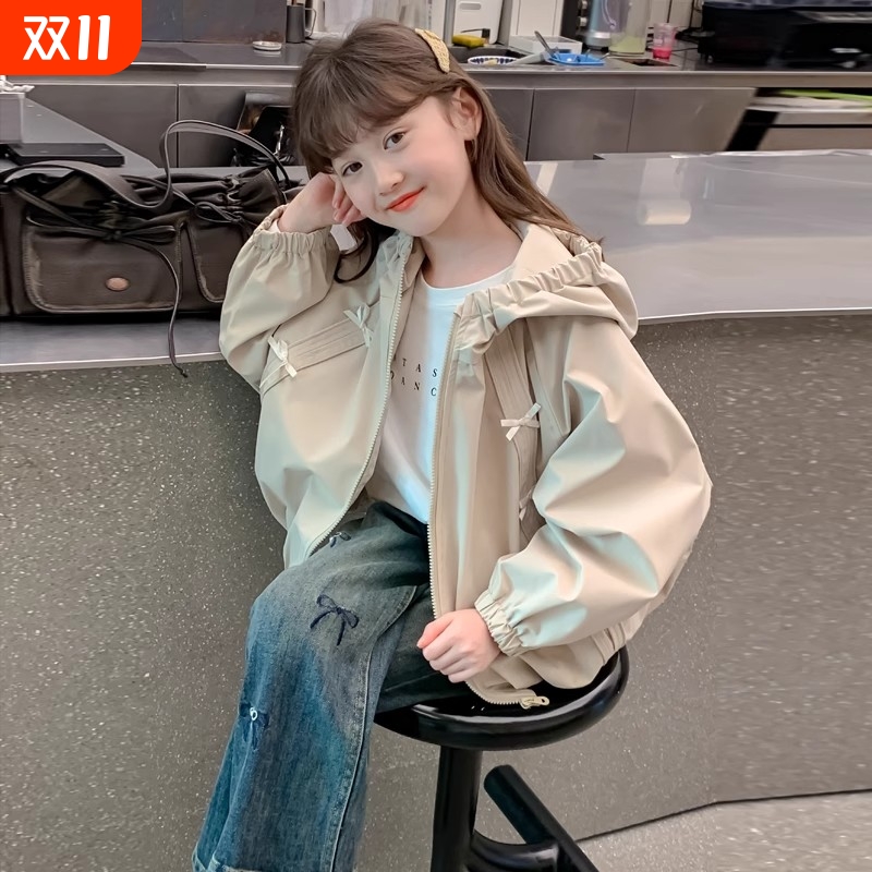 女童秋装外套2025新款儿童洋气女孩春秋季连帽蝴蝶结韩范夹克上衣