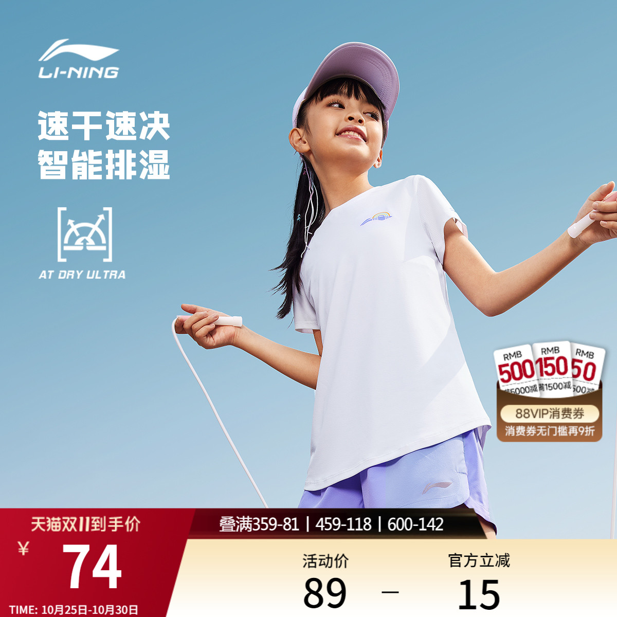 李宁童排湿圆领女短袖T恤