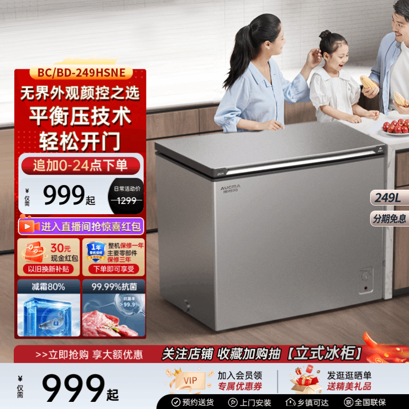 【国补20%】澳柯玛BC/BD-249HSNE家用卧式冰柜减霜1