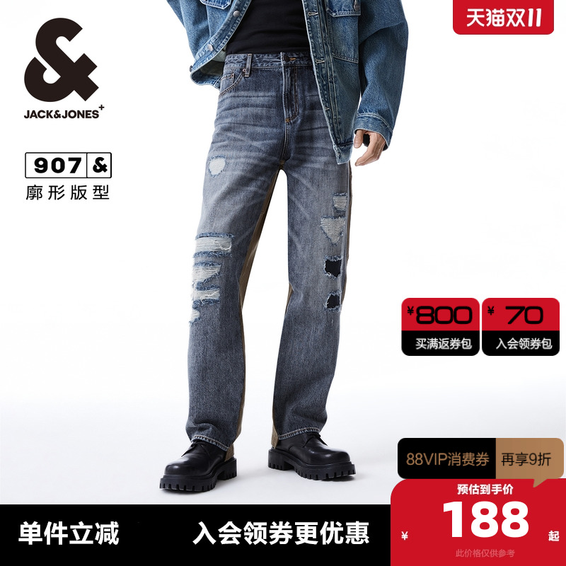 杰克琼斯长裤撞色拼接廓形牛仔裤