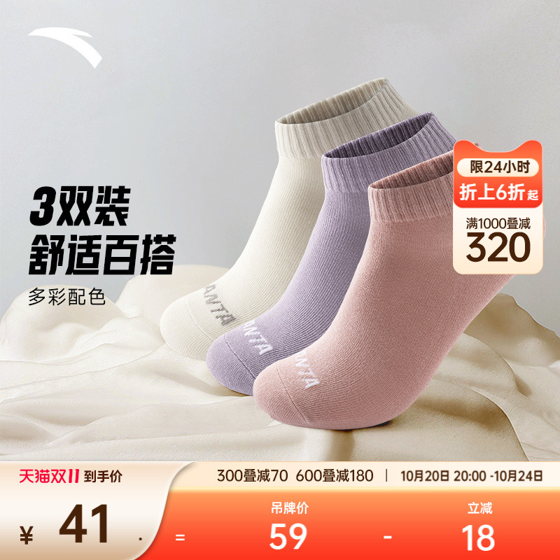 安踏运动袜3双装纯色女袜船袜跑步训练健身纯棉吸汗短袜短筒袜子