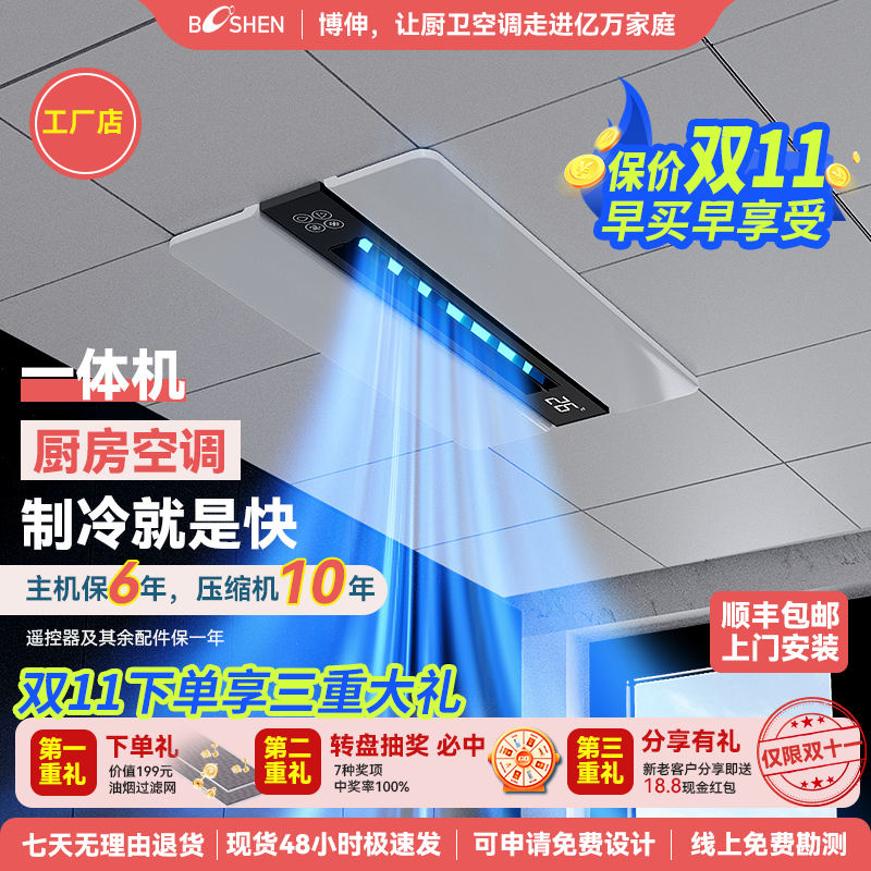 Booshen厨房空调强制冷大1匹冷量包打孔家用厨房专用空调无外