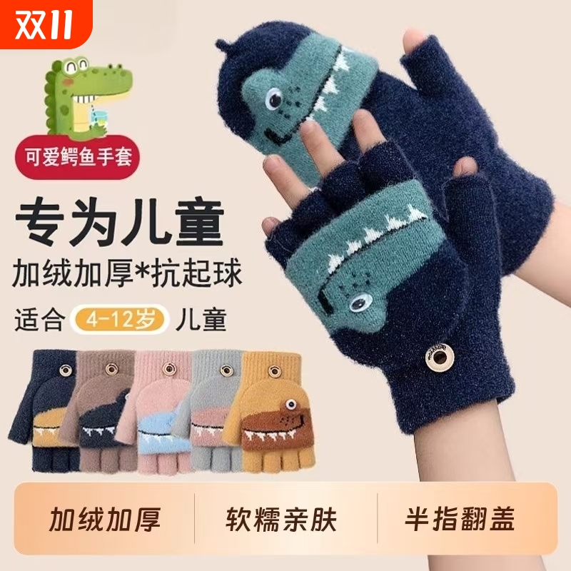儿童手套男童冬季保暖小孩写字翻盖男孩小学生半指女童防寒骑车