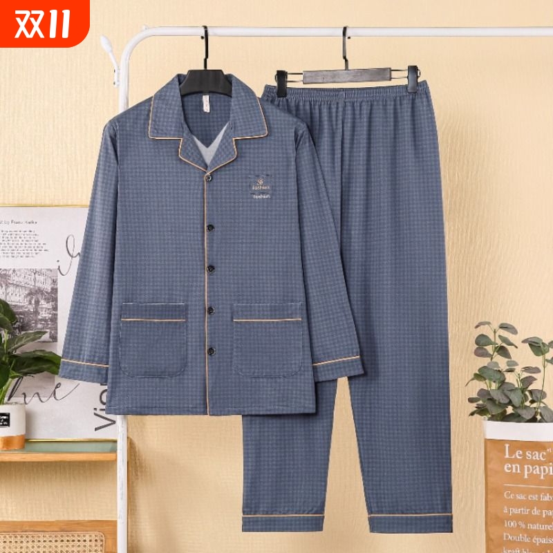 睡衣男款长袖男士睡衣中老年人春秋薄款加大码开衫中年爸爸家居服