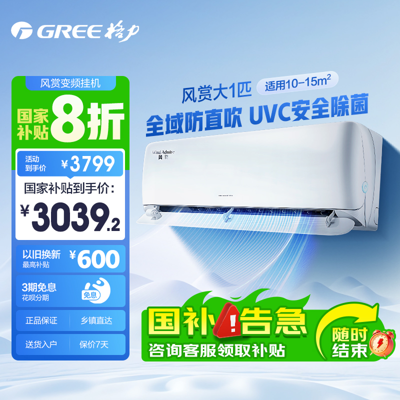【GREE/格力】新一级大风量变频冷暖空调1匹风赏挂机机以旧换新