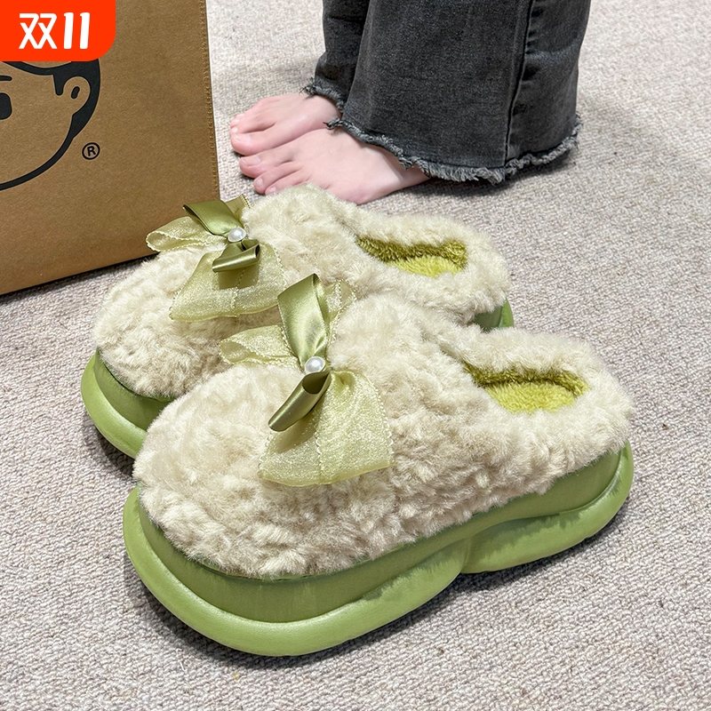 蝴蝶结毛绒棉拖鞋女士秋冬季2025新款室内居家保暖防滑厚底拖鞋女