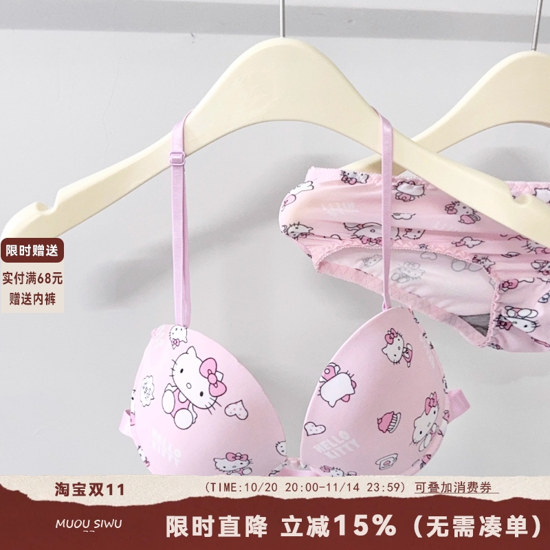 日系甜美可爱挂脖内衣女无肩带防滑聚拢小胸kt猫粉色前扣文胸套装