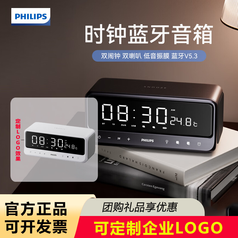 飞利浦TAS3609蓝牙音箱闹钟镜面全屏迷你便携家用桌面低音炮钢
