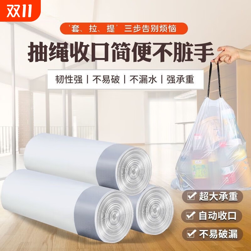 家用黑白抽绳垃圾袋防飞虫厨房大号加厚加大15只手提式抽绳塑料袋