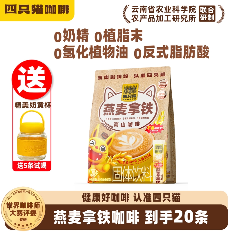 四只猫燕麦拿铁咖啡 0植脂末速溶咖啡上学上班早餐搭档 犯困提神