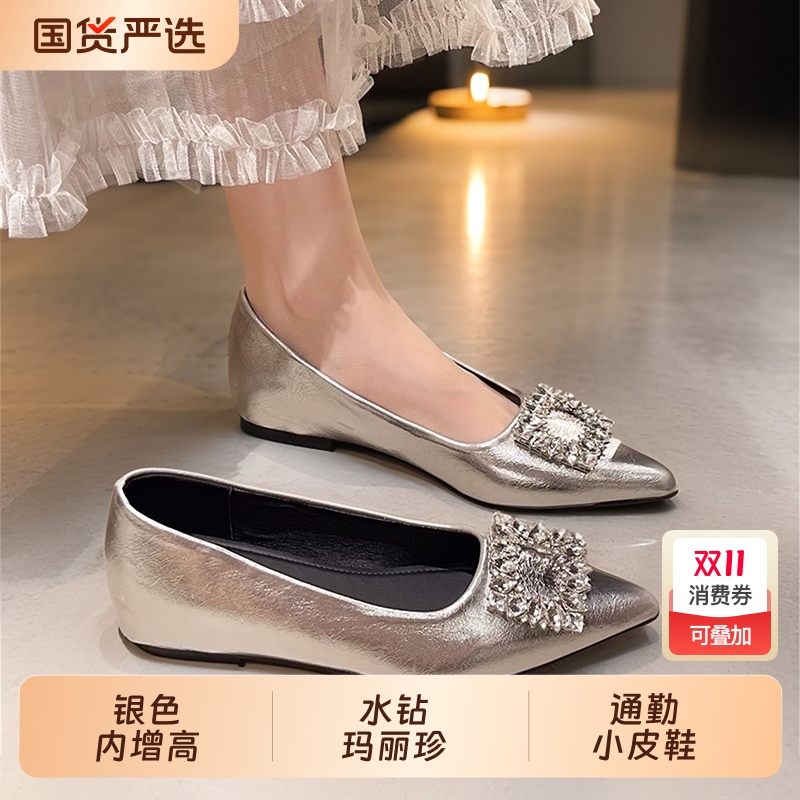 新款内增高单鞋女2025银色夏季尖头水钻玛丽珍鞋一脚蹬小皮鞋浅口