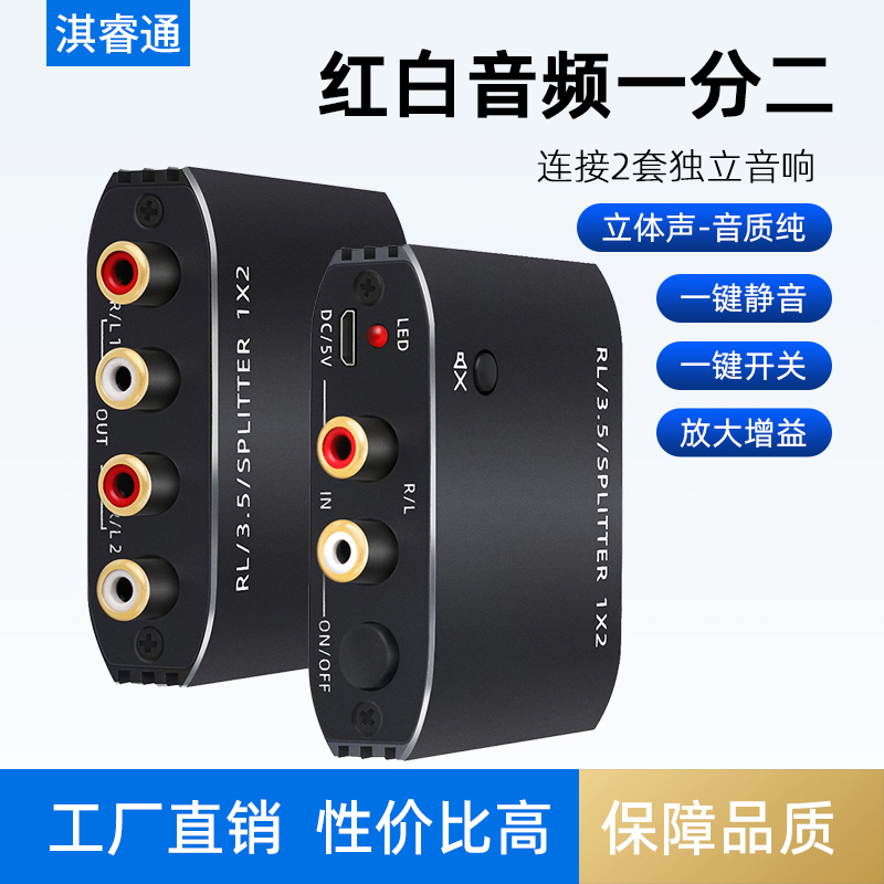 RL音频分配器 AV一进二出3.5红白耳机信号1分2复制多路高保