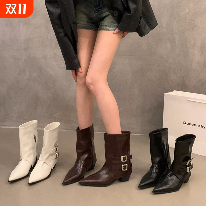 尖头高跟棕色小短靴女鞋2025新款春秋皮带扣中筒裤管靴子时尚短筒