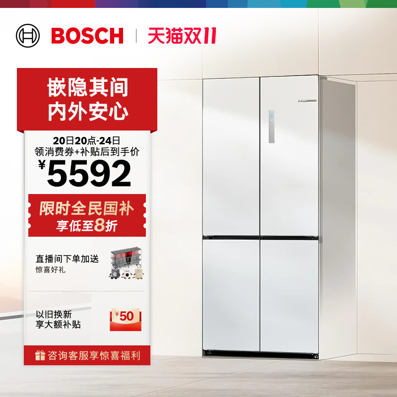 70cm宽超薄海尔冰箱418L白色零嵌入式十字四门一级能效家用旗
