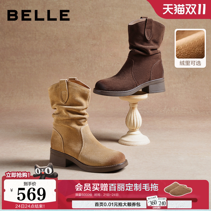 百丽复古V口显瘦堆堆西部靴女2025冬季新款厚底短靴子B2913