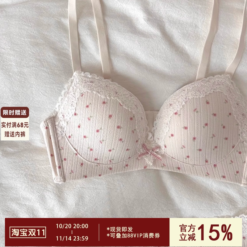 法式碎花蕾丝边内衣女小胸聚拢显大不空杯上托收副乳防下垂文胸罩