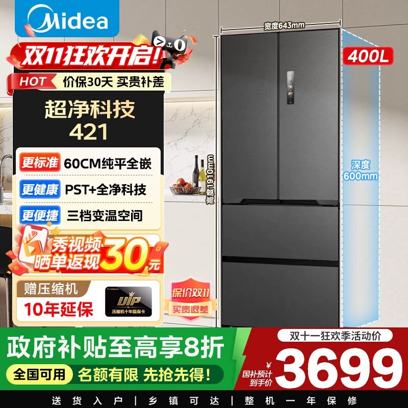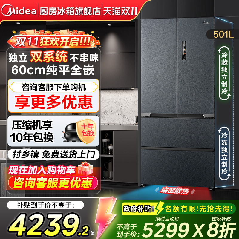 美的超薄421法式多门双开门零嵌入式白色电冰箱家用风冷无霜一级