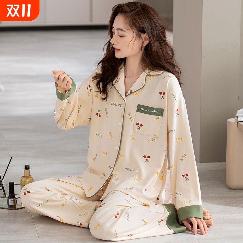 法式慵懒春秋季睡衣女开衫长袖长裤棉柔软舒适宽松大码家居服