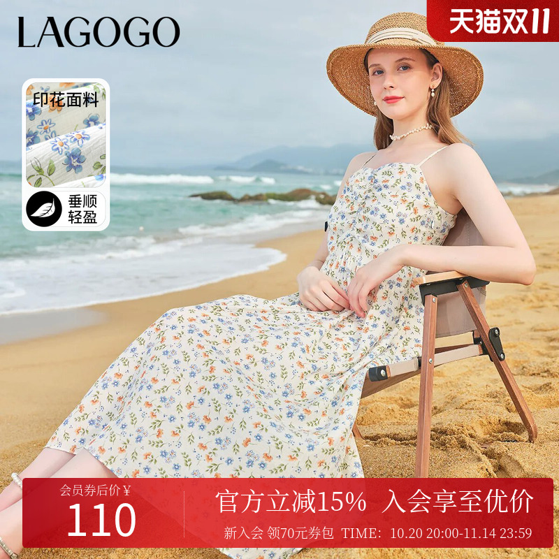 Lagogo拉谷谷茶歇碎花修身吊带裙2024夏新款法式温柔气质连