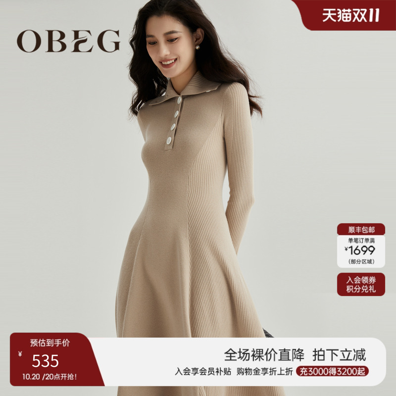 OBEG欧碧倩秋冬气质温柔翻领羊毛针织修身连衣裙50464521