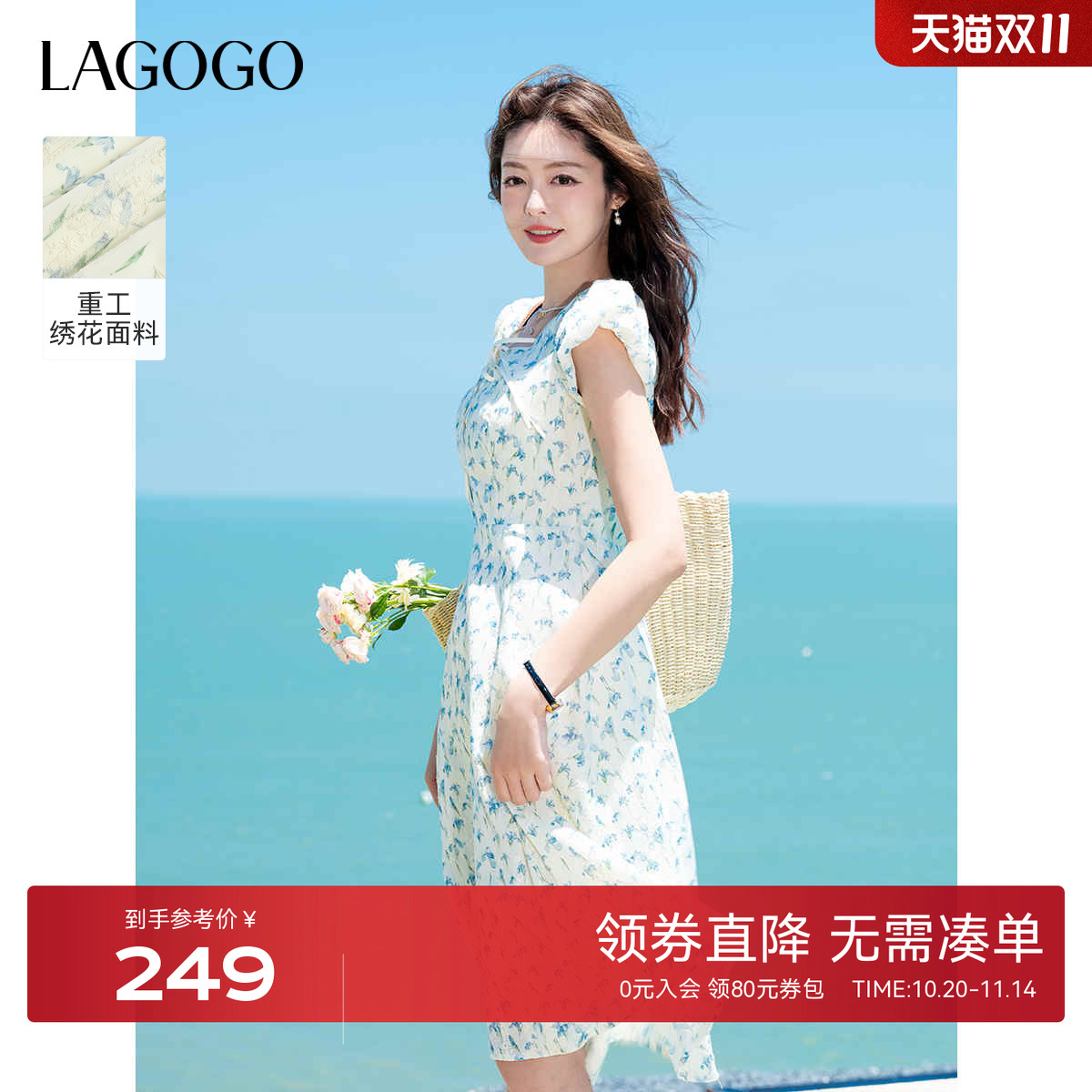 Lagogo拉谷谷温柔风白色绣花连衣裙女2024夏新款气质泡泡袖