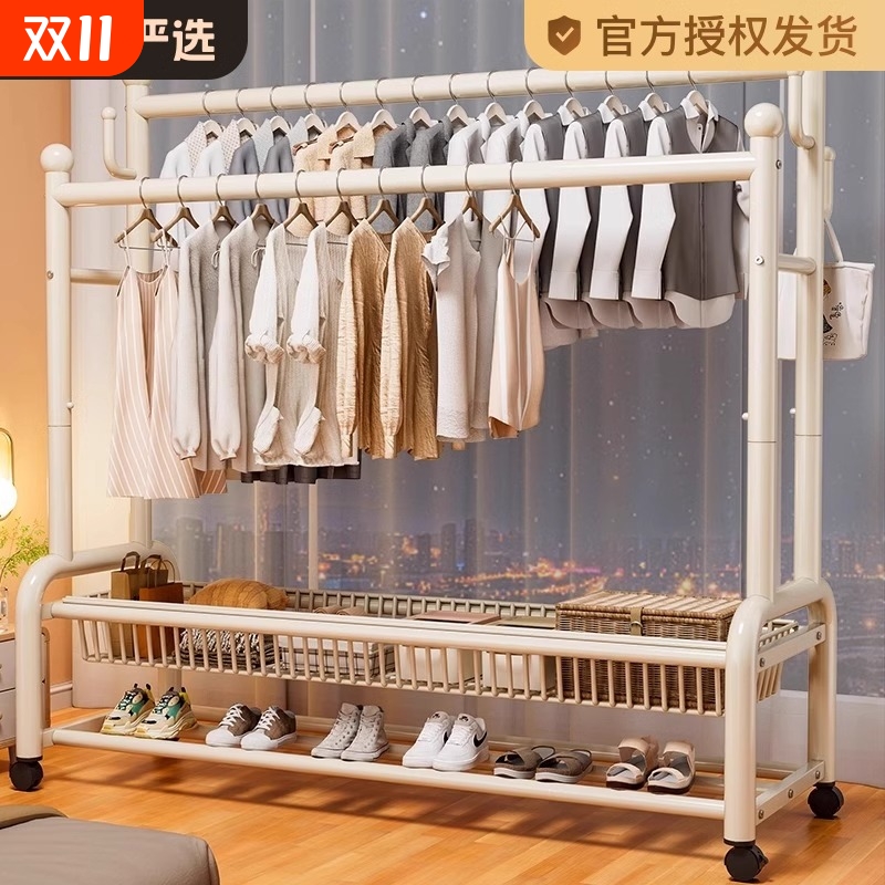 挂衣架卧室落地家用双杆晾衣服架子可移动网篮收纳置物房间衣帽架