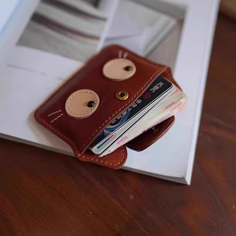 新款猫咪卡包植鞣牛皮质感复古迷你小巧卡夹零钱收纳小包女款卡通