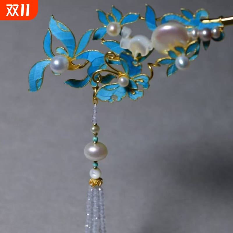 新中式复古蓝色花影流苏发簪古典雅致气质东方美学发饰女2025新款