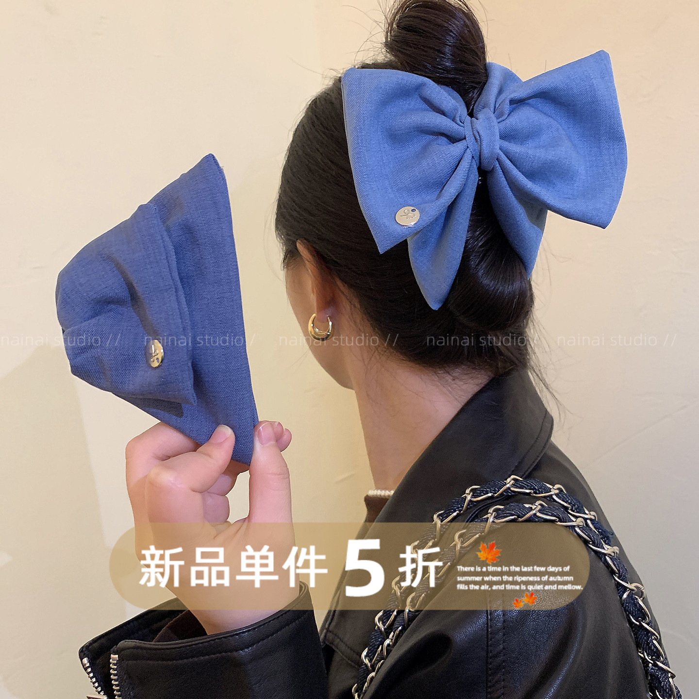 两戴!牛仔蝴蝶结抓夹~三角双层蓝色全盘饱满后脑勺鲨鱼夹发夹女