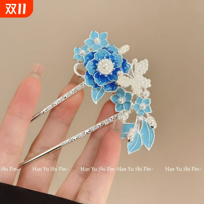 新中式蓝色牡丹花发簪女古风汉服头饰百搭发钗2025新款旗袍配饰品