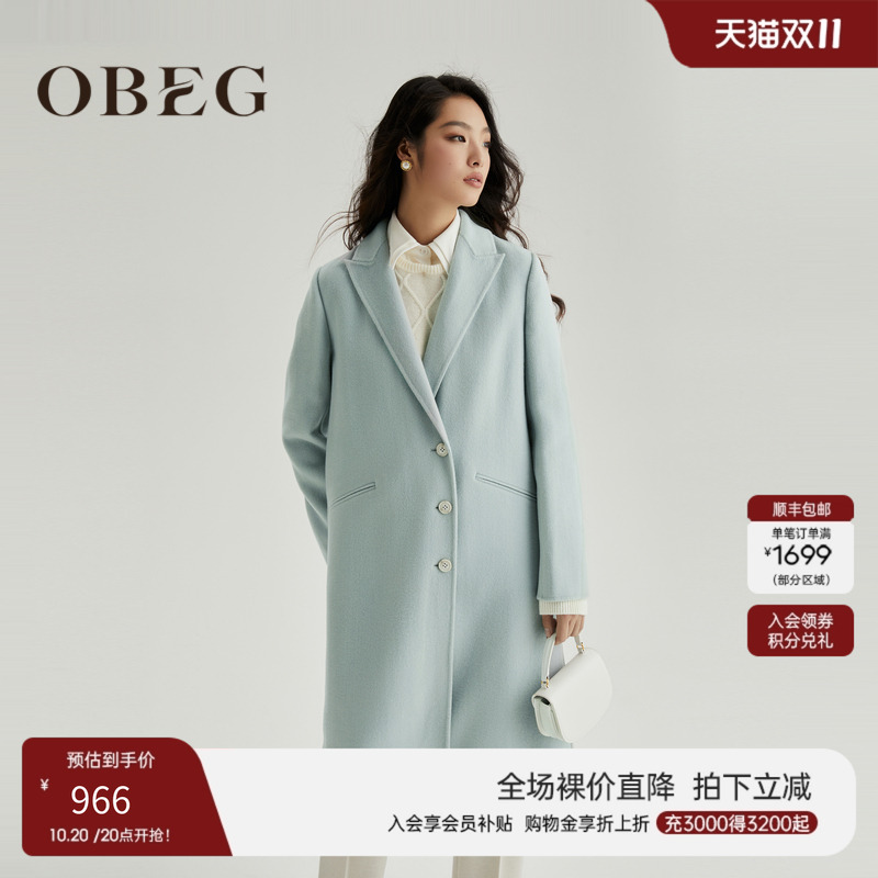 OBEG欧碧倩极简廓形羊毛大衣中长冬蓝色双面呢外套1044402