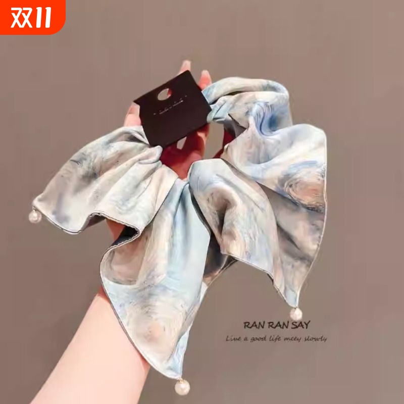 燃彩珍珠超大号晕染缎面高级感方巾大肠发圈女高级感蓝色头绳头饰