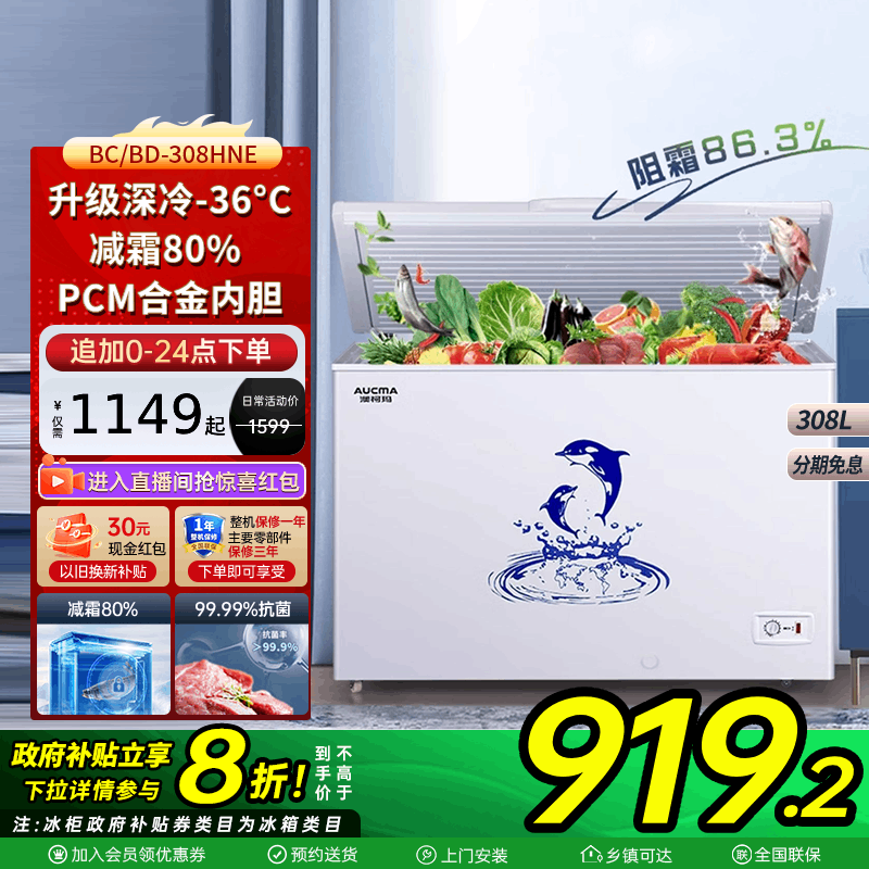 【国补20%】澳柯玛BC/BD-308HNE家商两用卧式冰柜变温