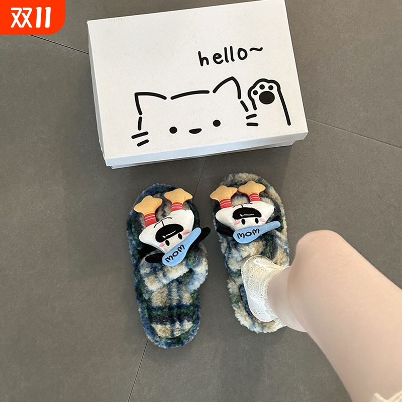 可爱卡通帕恰狗情侣秋冬毛毛鞋2025居家撞色格子一字带棉拖鞋露趾