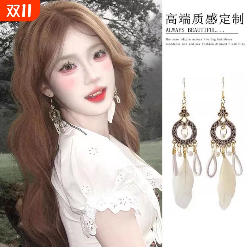 超仙流苏蚊香盘耳夹2025复古民族波西耳环坠出游拍照羽毛耳饰品女
