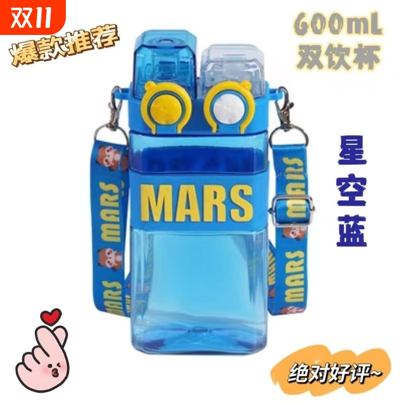 网红双口双饮吸管杯高颜值便携方形杯大容量水杯600ml蓝色食品级