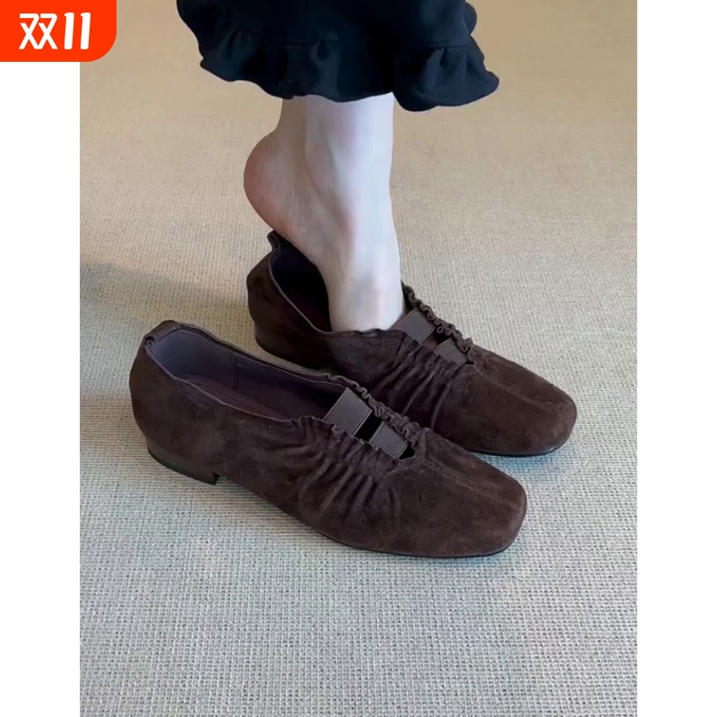 ~复古风方头褶皱平底单鞋女2025秋季新款百搭浅口玛丽珍鞋粗跟