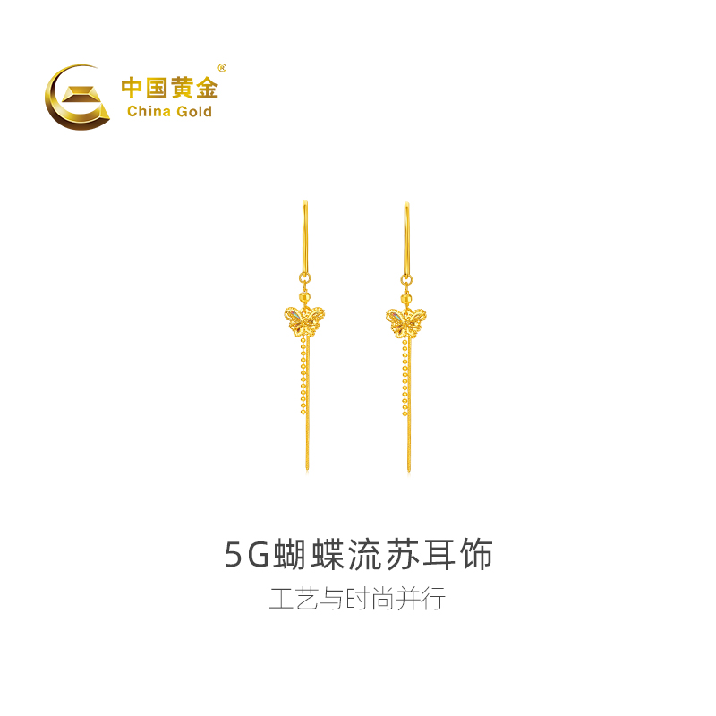 【中国黄金官方店】足金5G蝴蝶流苏耳饰时尚简约气质首饰新品送礼
