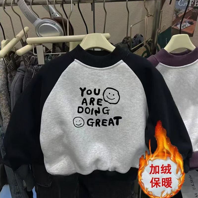 100%棉新款插肩拼色圆领加绒卫衣秋冬卡通印花中小宝宝上衣外套A