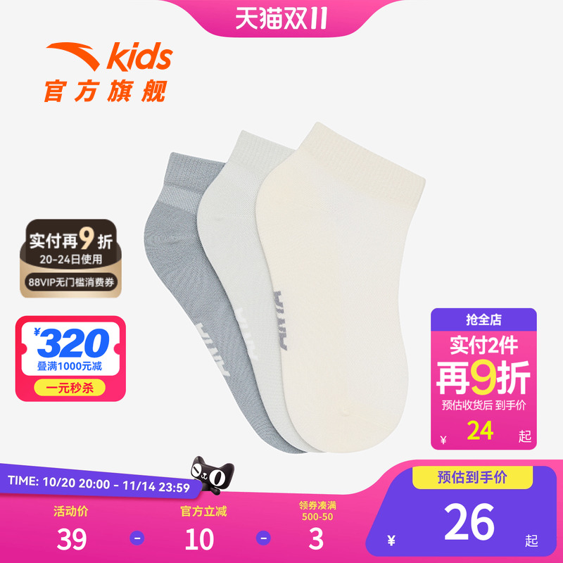 安踏儿童男女童短袜三双装2025夏季新款舒适透气中大童精梳棉袜子
