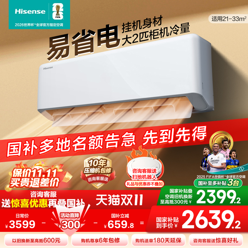 海信空调易省电280大2匹挂机式家用一级能效卧室客厅以旧换新补贴