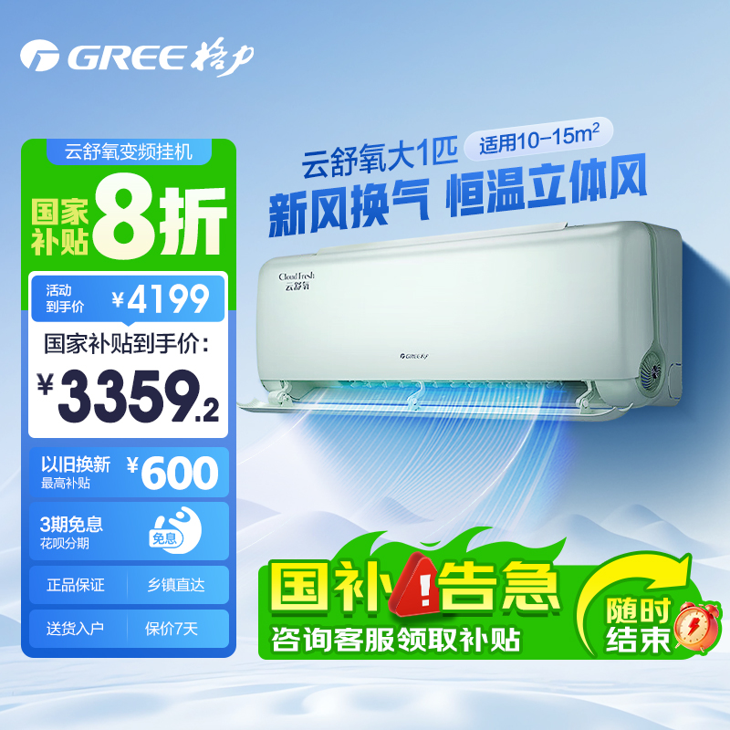 【GREE/格力】新一级大风量变频冷暖空调1匹云舒氧挂机机以旧换