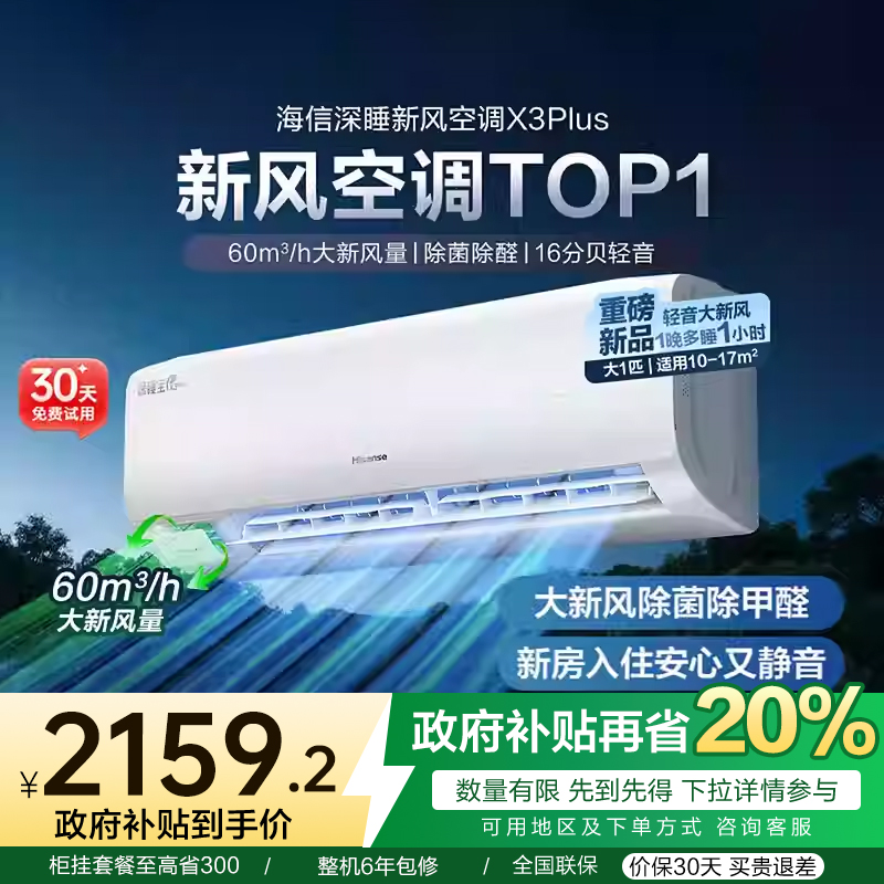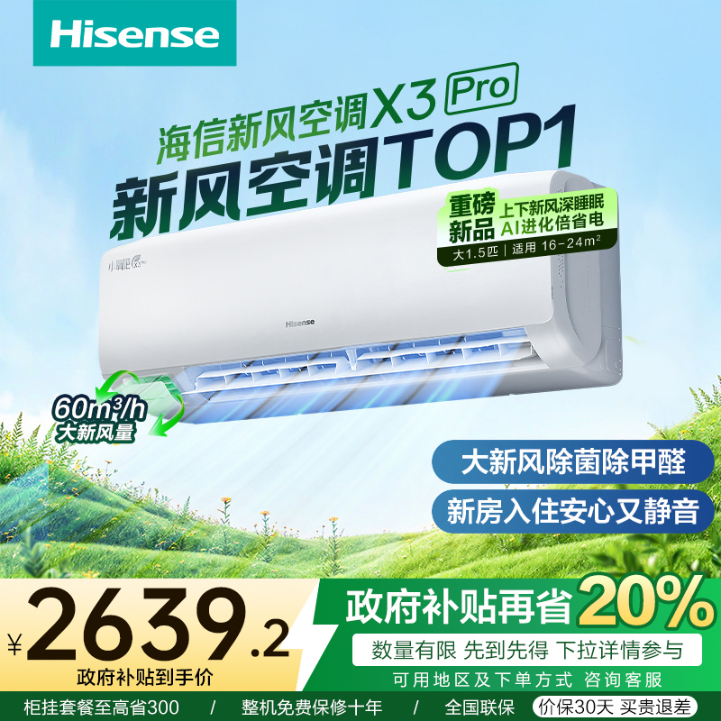 海信大一匹新风空调深睡宝X3plus挂机家用冷暖一级能效以旧换新