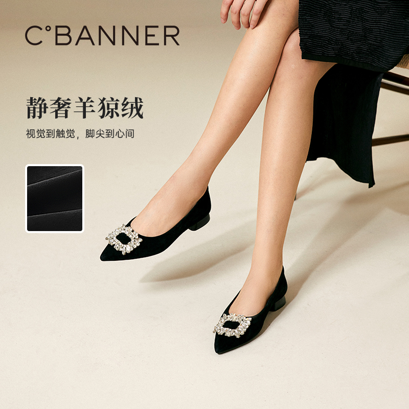 千百度水钻扣饰低跟浅口单鞋女2025秋季新款舒适平底鞋羊皮晚晚鞋