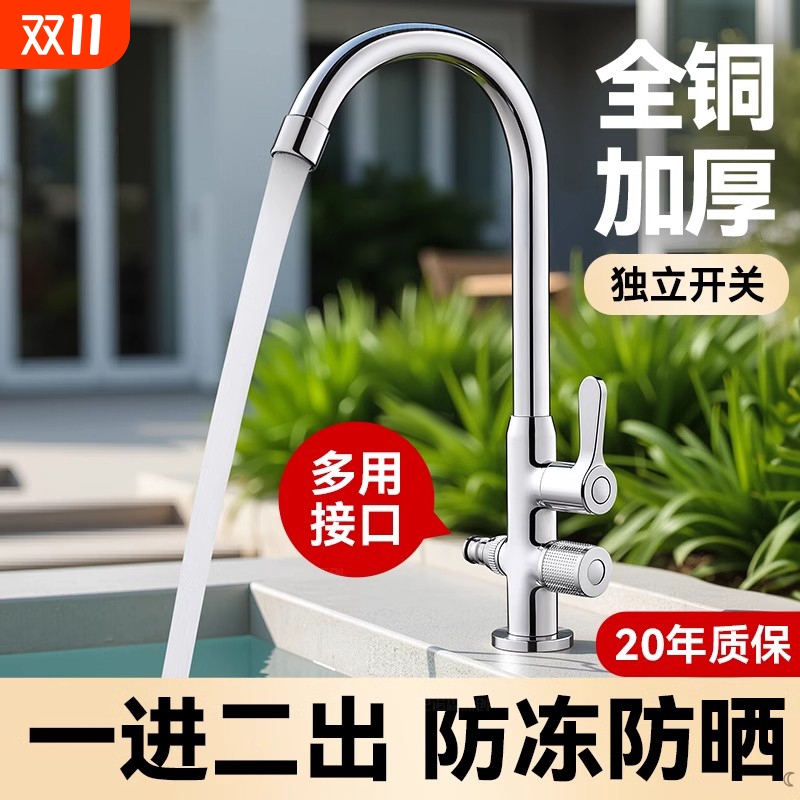 单冷户外庭院水龙头一进二出防冻洗手盆全铜松动加长厨房冷热接口
